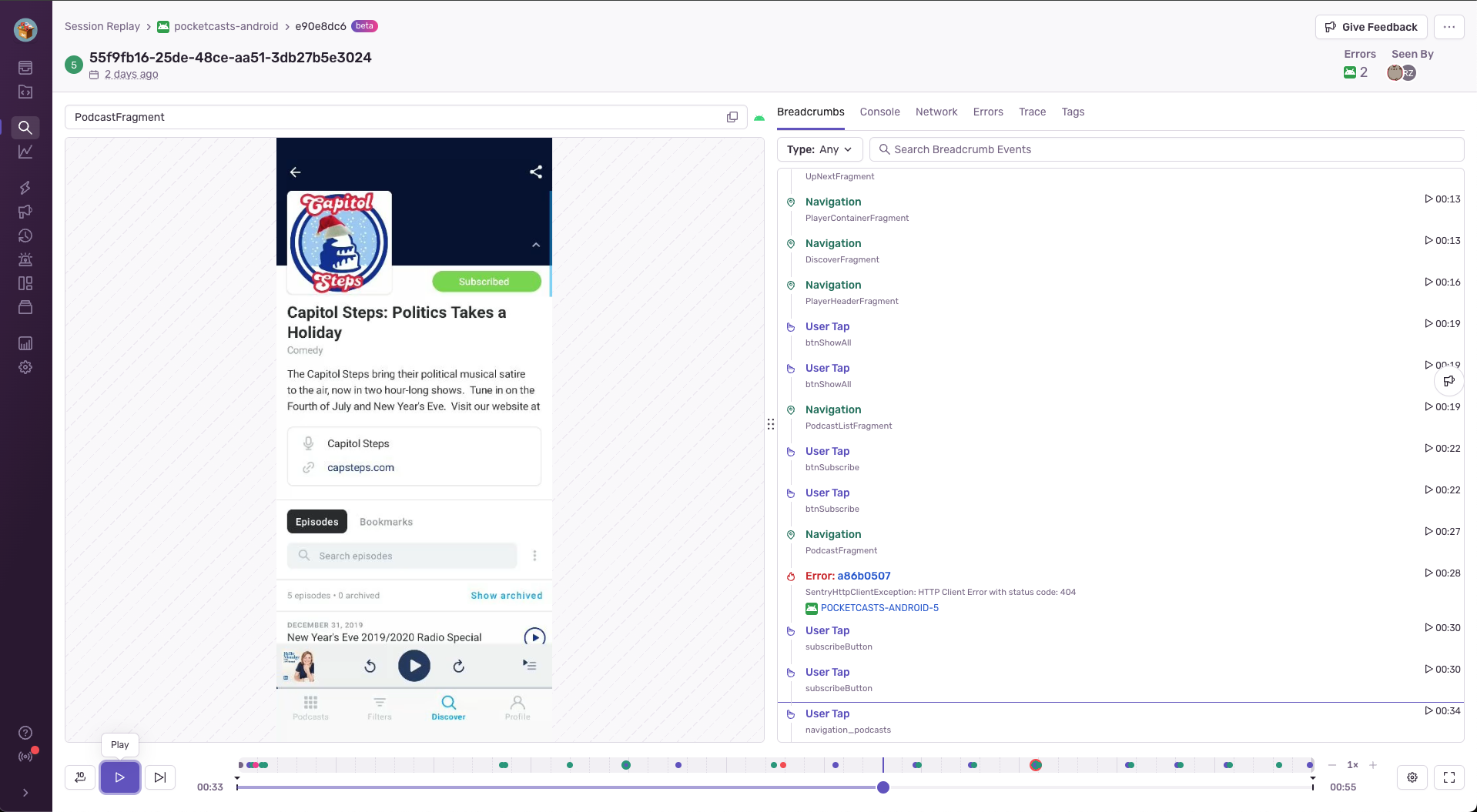 - Breadcrumbs: The replay breadcrumbs show when key user interactions took place, specifically: user taps with the relevant component, navigations, when the user put the app in background or foreground, and custom breadcrumbs set by your organization. Breadcrumbs also provide insight into the device of a given user session at particular timestamps: