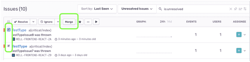 Warning: This will not affect the creation of future issues. In other words, any future event which would have created a new issue will still do so, regardless of similarity. Only events from the merged issues will be included in the new combined issue.
