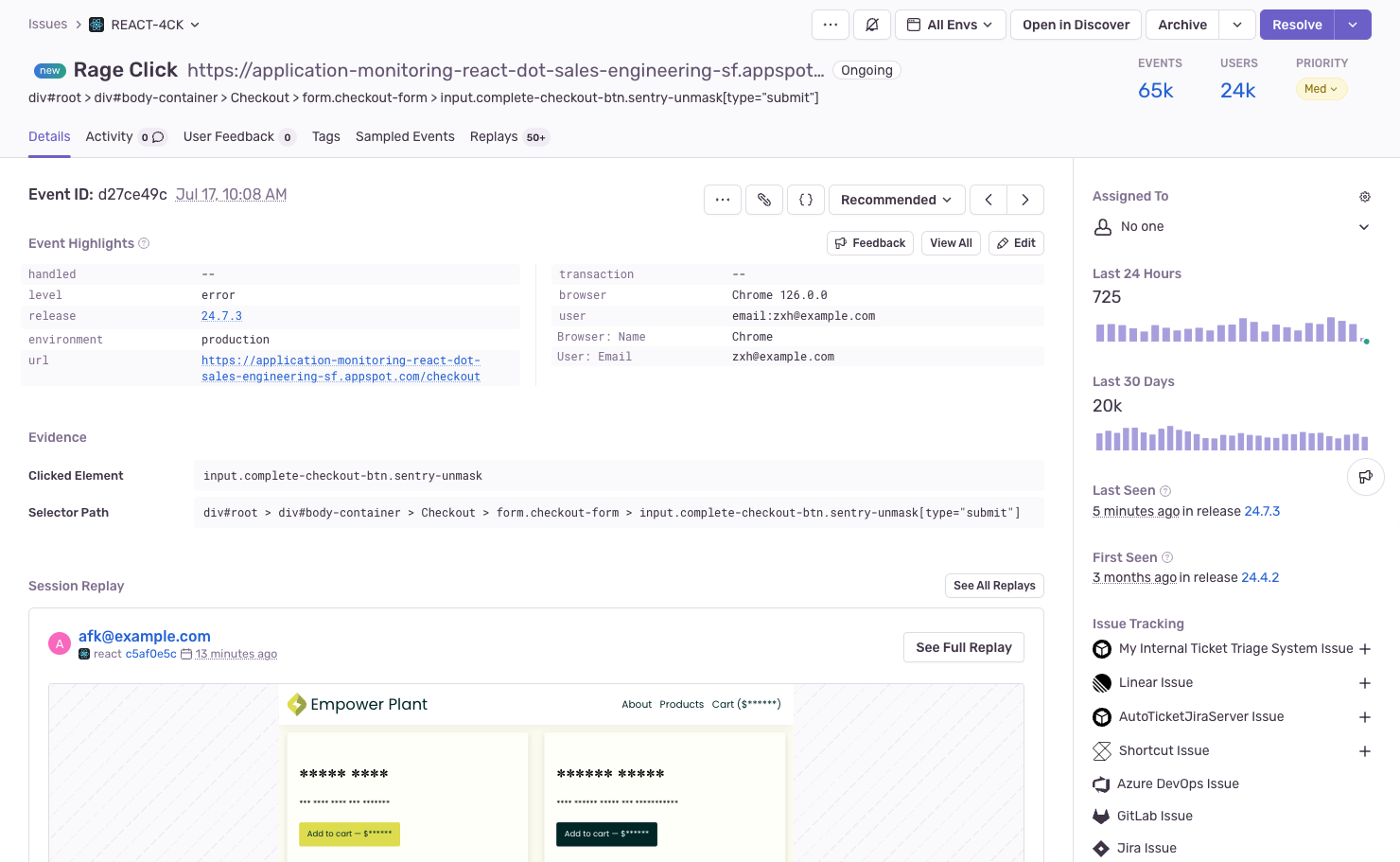 If you've enabled Session Replay, you'll be able to see rage click issues on the Issues page in Sentry. Rage clicks are a series of consecutive clicks on the same unresponsive page element. They are a strong signal of user frustration and most likely deserve your attention.